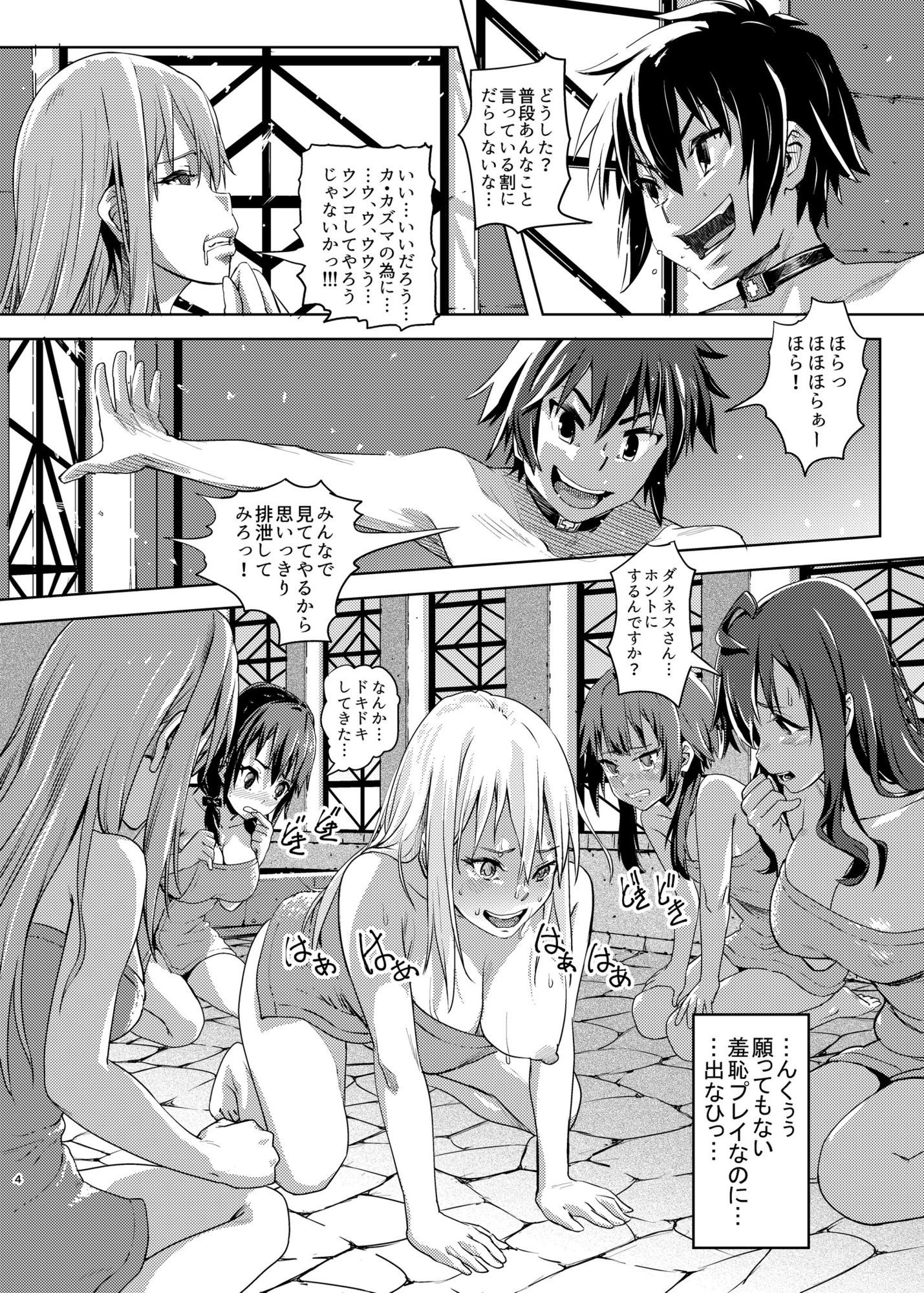 願いの叶う呪いのチョーカーを着けてしまったカズマ…だが、何を願ったのかわからない…仕方なくカズマが望む事を試してみることになった。心配する5人に変態性欲を発揮してやりたい放題したが、外れる気配がない。そこで、カズマは隠し通してきた性癖「スカトロ」へと…