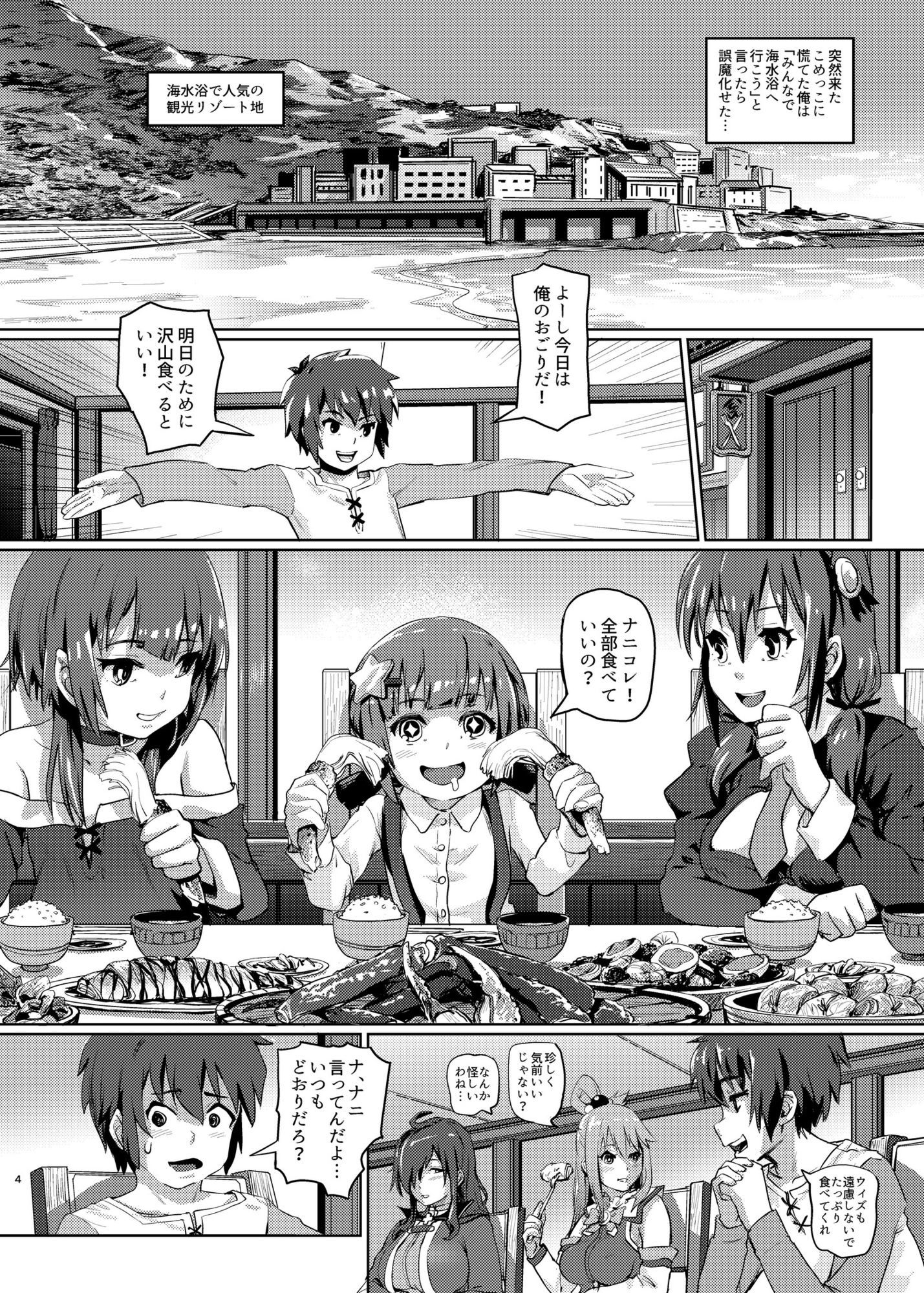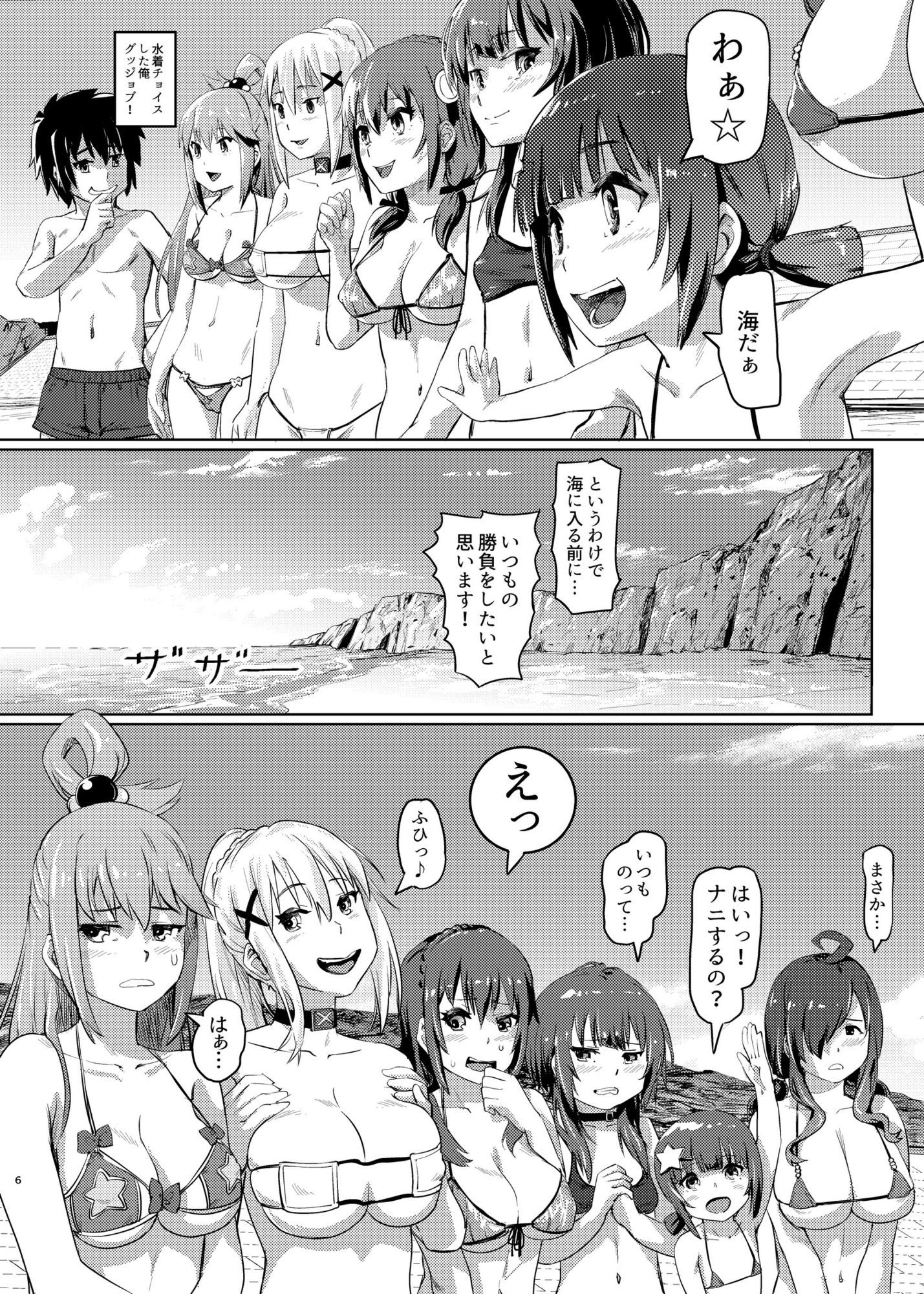 めぐみんとゆんゆんの勝負中にテレポートしてきた こめっことウィズも一緒に、海にバカンスへ行くカズマのPT。 そこでもいつもの脱糞勝負を行うことに…