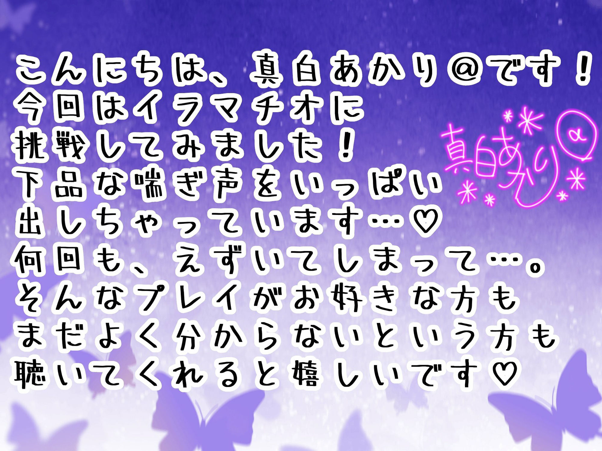真性ドM声優真白あかりさん。 「雌ブタ」 「肉便器」 「変態女」 など言葉責めで罵倒されながら、 「聖水浴び」 「イラマチオ」 「高速手マン」 「乳首つまみ」 「スパンキング」 されたいと願望するあかりさんがイラマチオオナニーにチャレンジ! いや、あかりさんにとってはチャレンジというより悦び! 口まんことおまんこの2穴で激しく絶頂!ディルドをご主人様であるリスナー様の熱いおちんぽと妄想しながらのイラマチオオナニー。