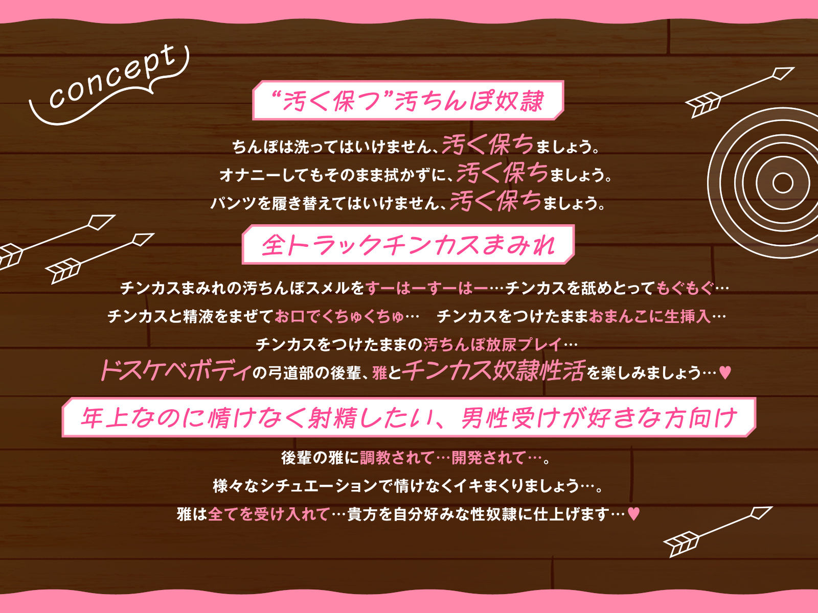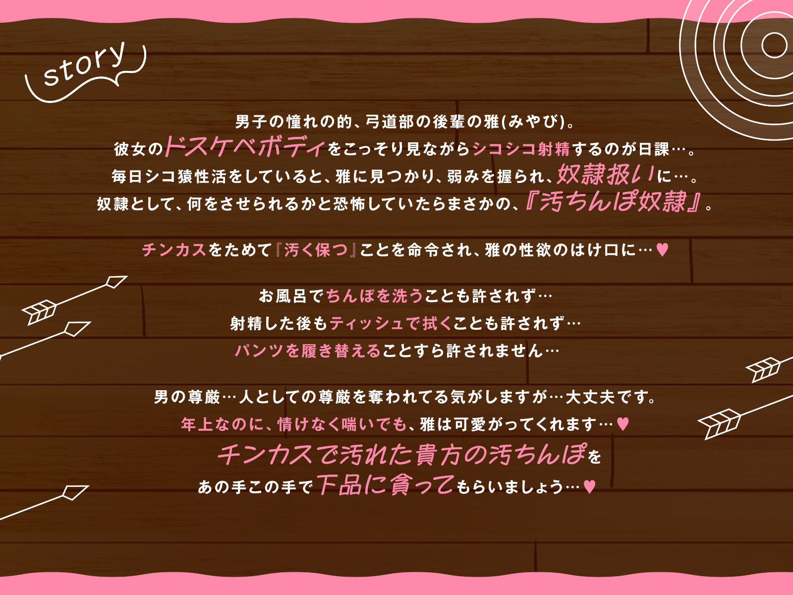貴方はドスケベボディ後輩・雅の『汚ちんぽ奴○』に。チンカスをためて『汚く保つ』ことを命令され、雅の性欲のはけ口に♡お風呂でちんぽを洗うことも許されず…射精した後もティッシュで拭くことも許されず…パンツを履き替えることすら許されません… 男の尊厳…人としての尊厳を奪われてる気がしますが…大丈夫です。年上なのに、情けなく喘いでも雅は可愛がってくれます…♡ チンカスで汚れた貴方の汚ちんぽを下品に貪ってもらいましょう…♡