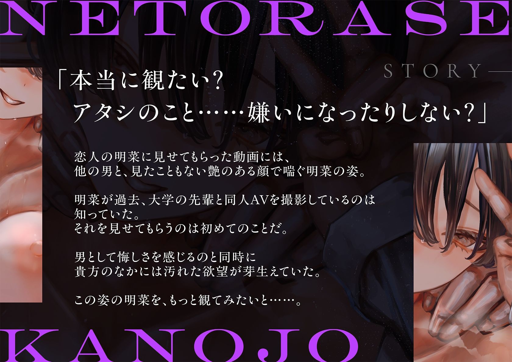 「本当に観たい? アタシのこと……嫌いになったりしない?」 恋人の明菜に見せてもらった動画には、 他の男と、見たこともない艶のある顔で喘ぐ明菜の姿。 明菜が過去、大学の先輩と同人AVを撮影しているのは知っていた。 それを見せてもらうのは初めてのことだ。 男として悔しさを感じるのと同時に 貴方のなかには汚れた欲望が芽生えていた。 この姿の明菜を、もっと観ていみたいと……。