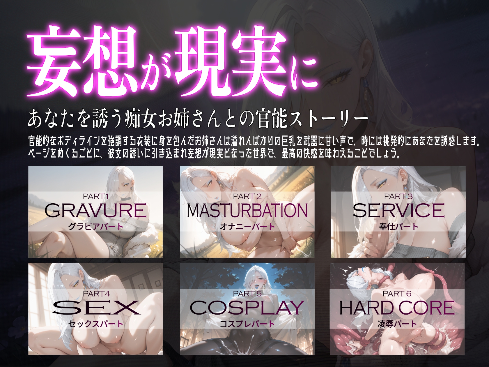 このCG集では、巨乳で妖艶なお姉さんが様々なシチュエーションで貴方を魅了します。グラビアから始まり、彼女たちの官能的な世界へと誘います。 各パートで異なる魅力を引き出し、刺激的な体験をお届けします!