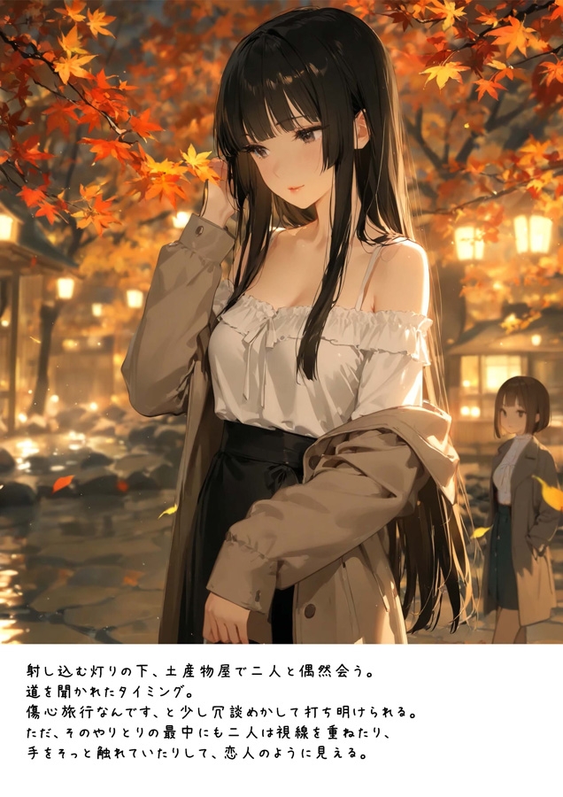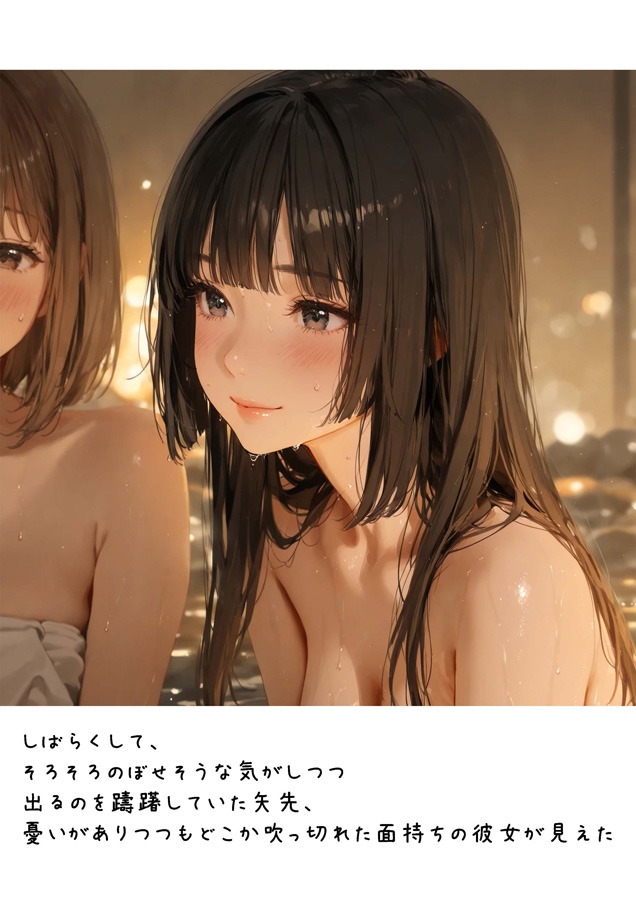 山奥の温泉で出会ったふたりの女。 湯けむりに溶ける肌、重なる吐息、背徳の夜。 友人以上、恋人未満の距離が、やがて三人を絡めとる。 しっとりと官能的な混浴3Pを描く、AI×レタッチによるビジュアルCG集。