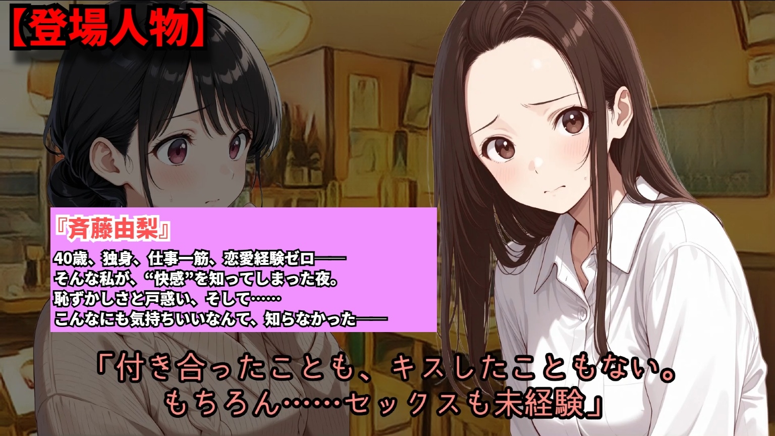 40歳にして処女、自慰経験すらない由梨。 ある夜、大学時代の後輩と再会し── 優しい手に触れられ、人生初の快感を知ってしまう。 羞恥と戸惑い、そして何度も迎える絶頂。 「女として生きること」を初めて知った夜の記録。 処女熟女×女友達の“優しく背徳的”な百合エロ作品。