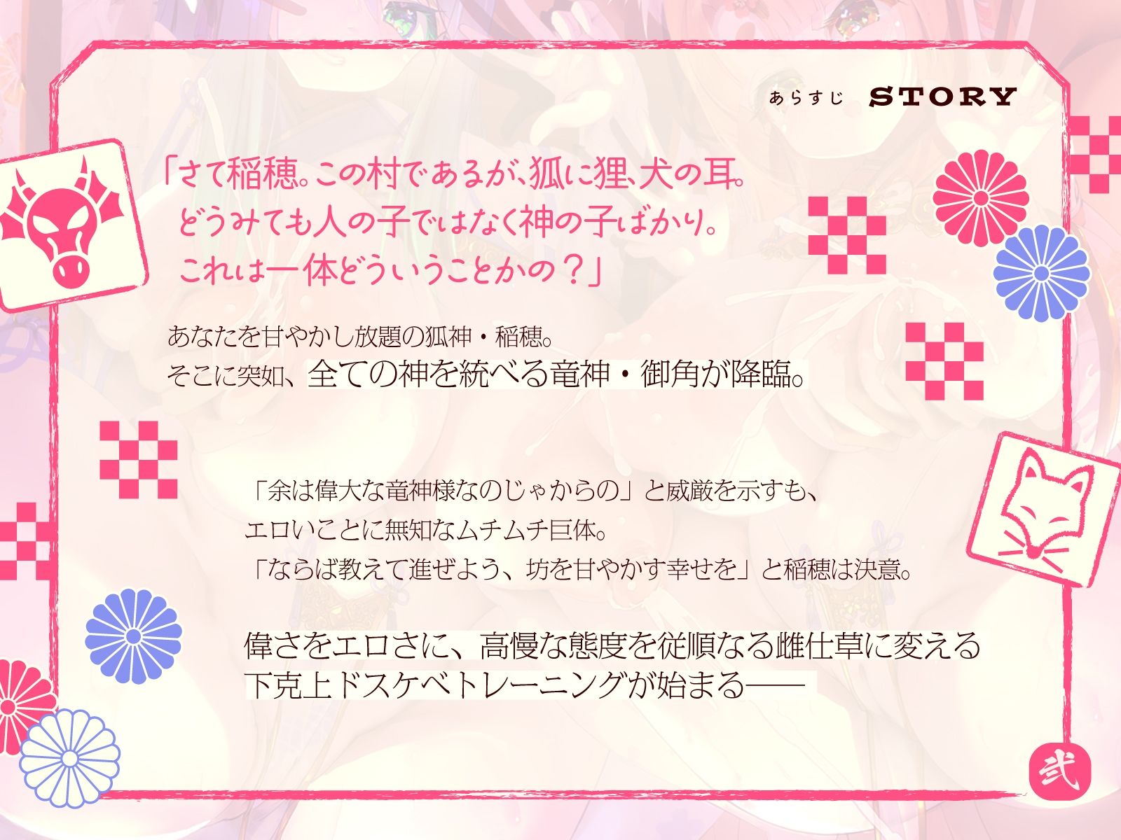 「さて稲穂。この村であるが、狐に狸、犬の耳。どうみても人の子ではなく神の子ばかり。これは一体どういうことかの?」あなたを甘やかし放題の狐神・稲穂。そこに突如、全ての神を統べる竜神・御角が降臨。「余は偉大な竜神様なのじゃからの」と威厳を示すも、エロいことに無知なムチムチ巨体。「ならば教えて進ぜよう、坊を甘やかす幸せを」と稲穂は決意。偉さをエロさに、高慢な態度を従順なる雌仕草に変える下克上ドスケべトレーニングが始まる――