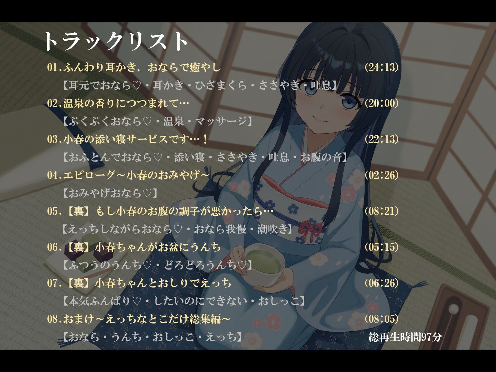 「わたしの“おなら”で…癒やされてくださいね…?」柔らかな膝枕と、お耳かき。あたたかな温泉と、お背中流し。それからおふとんで添い寝まで――。ちょっぴり奇妙で、だけどやさしい。あたたかな時間をあなたに。