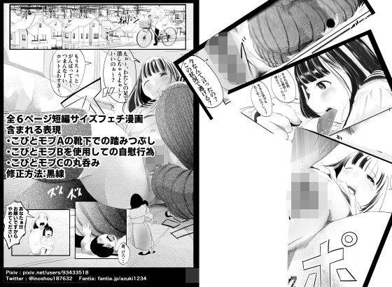 6ページのサイズフェチ系短編漫画です。こびとモブを使用しての踏みつぶし、自慰行為、丸呑みシーンが描かれます。