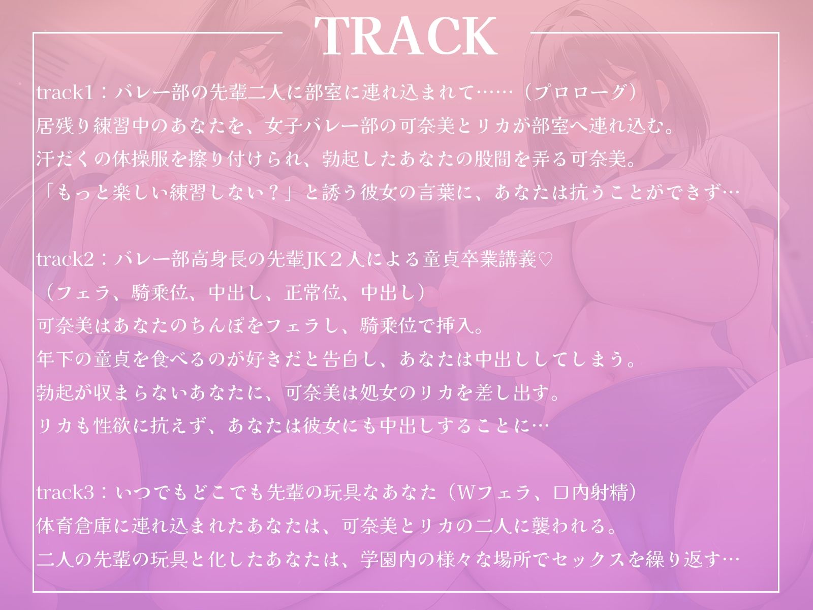 「もっと楽しい練習しない?♡」……居残り練習をしていたバレー部のあなたは、高身長な巨乳先輩、”在川可奈美”と”伊野田リカ”に部室へ連れ込まれる。可奈美は勃起したあなたを誘い、フェラから騎乗位へ。年下の童貞を食べるのが好きだと告白し、あなたはそのまま中出し。しかし勃起は収まらず、可奈美に促され、今度は処女のリカにも中出ししてしまう。この日以降、あなたは二人の先輩のエッチな玩具となるのだった…