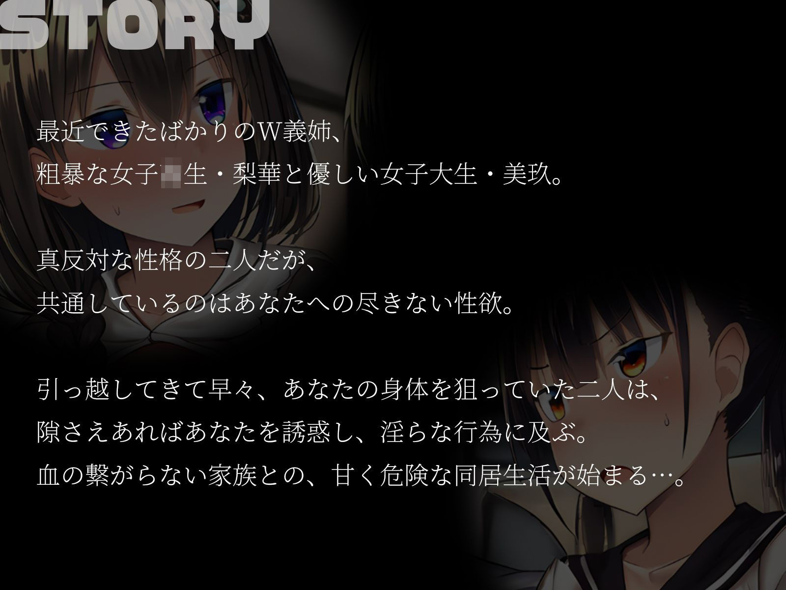 最近できたばかりのW義姉、粗暴な女子高生・梨華と優しい女子大生・美玖。真反対な性格の二人だが、共通しているのはあなたへの尽きない性欲。引っ越してきて早々、あなたの身体を狙っていた二人は、隙さえあればあなたを誘惑し、淫らな行為に及ぶ。血の繋がらない家族との、甘く危険な同居生活が始まる…。