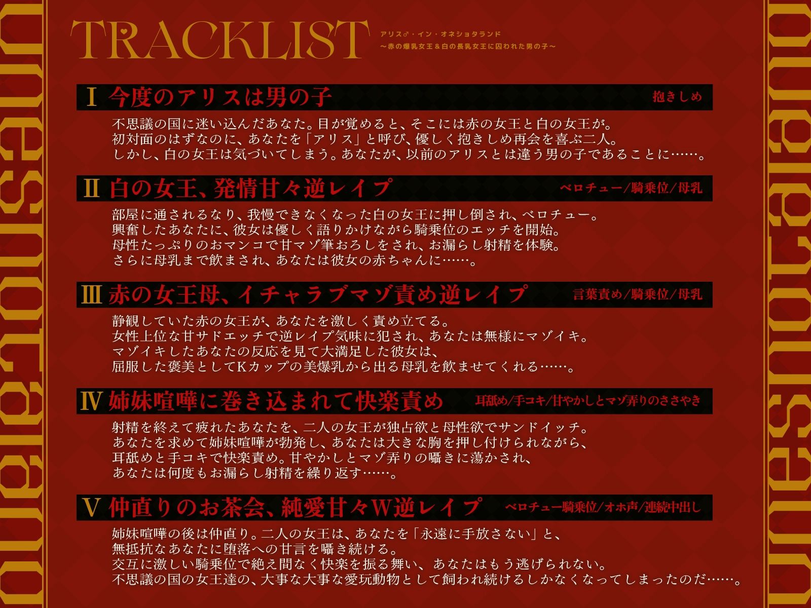 不思議の国にまたアリスが迷い落ちてきた。女の子ならお茶会を……だけどこのアリスは男の子。男の子のアリスには、もっと特別な宴を開きましょう。「良い声で泣け♡……舌を出して私に媚びろ♡……嫌がるなら極刑だ♡」「姉様、アリスが怖がってる♡……可愛いアリスにはもっと優しくシてあげなきゃ♡」可愛そうな、男の子のアリス。君はもう、元居た場所には帰れない……