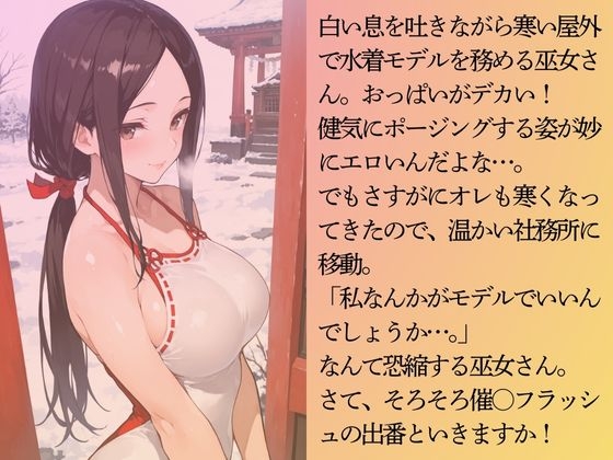 小さな神社に撮影に訪れたオレ。そこにいたのはシャイで巨乳のかわいい巫女さん!神社の宣伝用写真を撮って欲しいと頼まれたオレは、巫女さんが水着モデルになってくれるなら、と条件を出した!「神社のためなら」と引き受けてくれた巫女さん。今回は新年にふさわしい神社が舞台の水着シリーズ!お楽しみください!