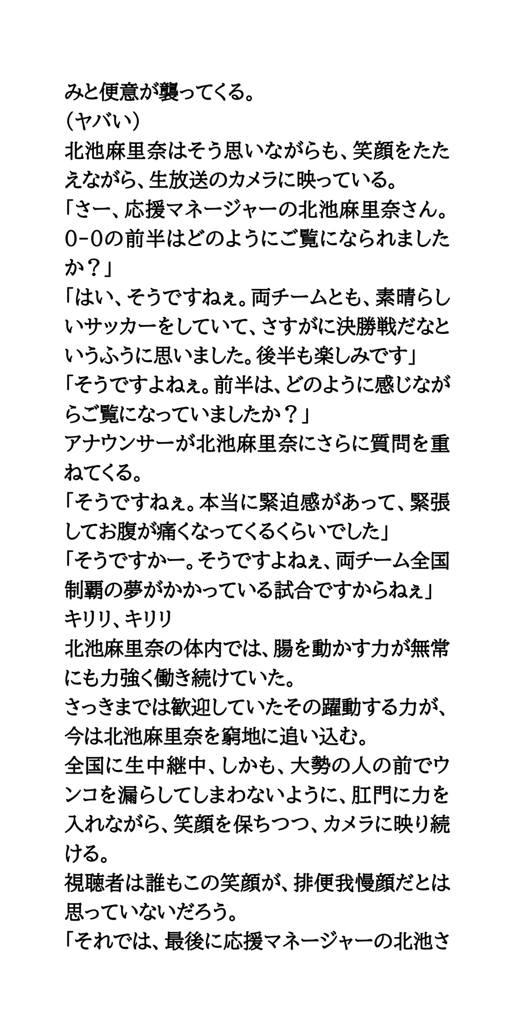 高校サッカーの応援マネージャーを務めている女優は、生放送中に、猛烈な便意を催していた。なんとか中継中は耐え、ハーフタイムのときにトイレへと急行する。トイレの前には、大勢の人が列に並んでいた。列の最後尾に並ぶも、ついにその瞬間を迎えてしまう。
