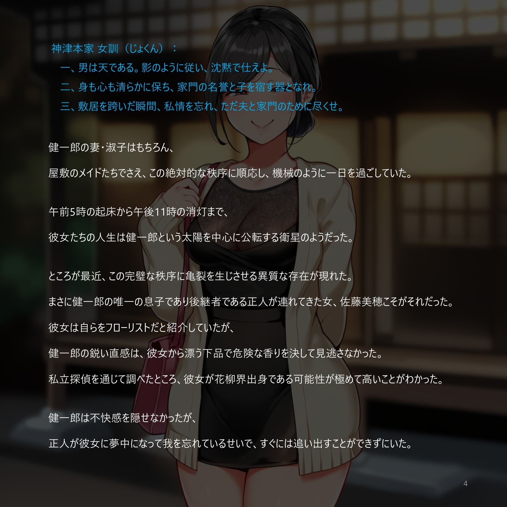 男は天、女は影。 日本財界の巨頭・神津グループ総帥ケンイチロウ。 その家父長制に支えられた神津家が、内側から崩壊していく記録。