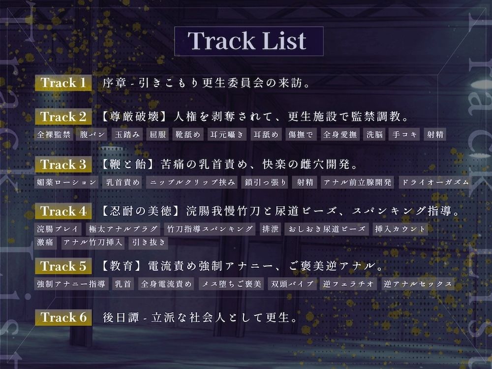 //// 引きこもり更生指導調教 × 絶対服従ディストピアバイオレンス × 強○メス堕ち //// —— 少子高齢化が進み、引きこもりが社会問題化した未来の世界。全国の引きこもりを【指導】【教育】して社会復帰へと導くことを目的に《引きこもり更生委員会》が設立されました。陵○から暴力まで何でもあり、飴と鞭による壮絶な指導調教——。身も心も尊厳まで破壊されて、立派な社会人としての更生を目指します。