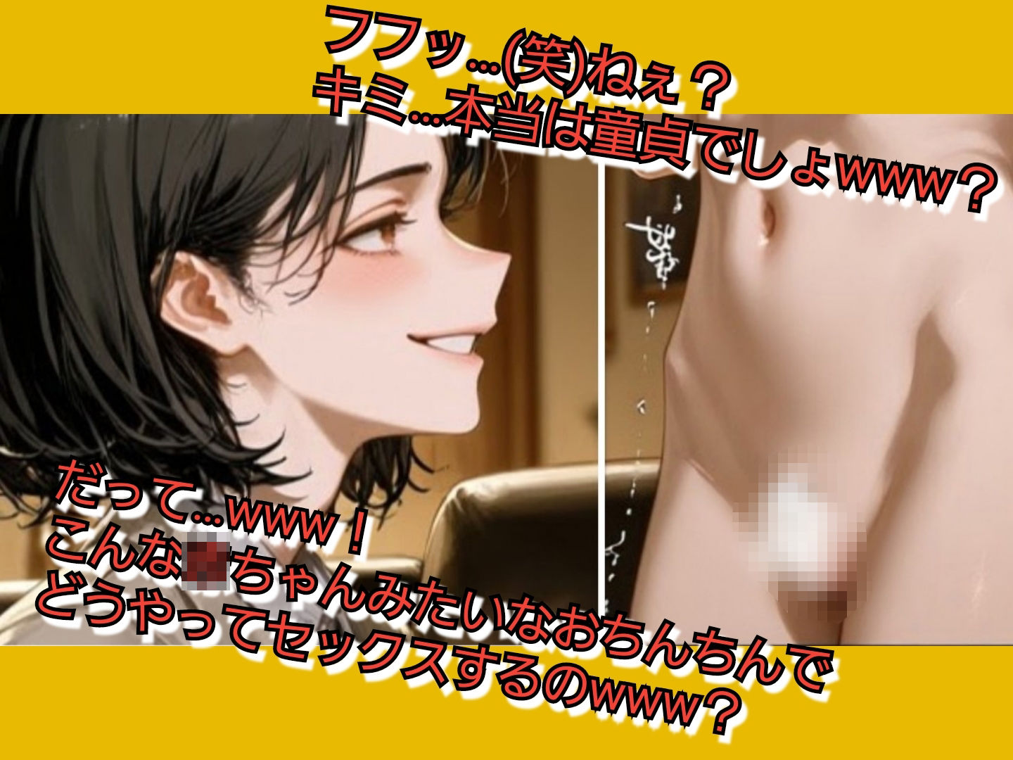 短小包茎M男向け専門のサークル『いじめっ娘倶楽部』のオナサポボイス!短小包茎で軟弱な男子がエッチでちょっと意地悪なお姉さんの部屋に呼ばれてパンツを脱がされ…。 極小さでパイパンのお子様チンポを見られて笑われます。 本当は童貞なのに見栄をはって嘘ついてたのがバレて嘲笑われ、罰としてオナニーまでさせられてしまうSPH&CFNMストーリー。