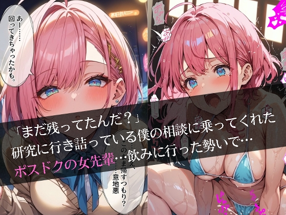 深夜の研究室、行き詰まる僕を誘ったのは憧れのポスドク・桜先輩。お酒の勢いでホテルへ連れ込めば、そこには白衣を脱ぎ捨て、情欲に瞳を潤ませる一人の女性の姿が。28歳・Gカップの知的な彼女が、密室で見せる「メスの顔」と、熱っぽいカメラ目線の痴態に理性が崩壊!全31P+CG集で贈る、普段の明るい姿からは想像できない濃密な一夜。彼女のギャップに、あなたも心ゆくまで溺れてください。