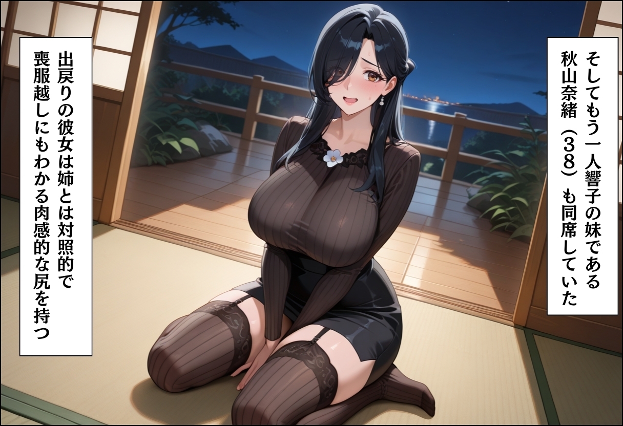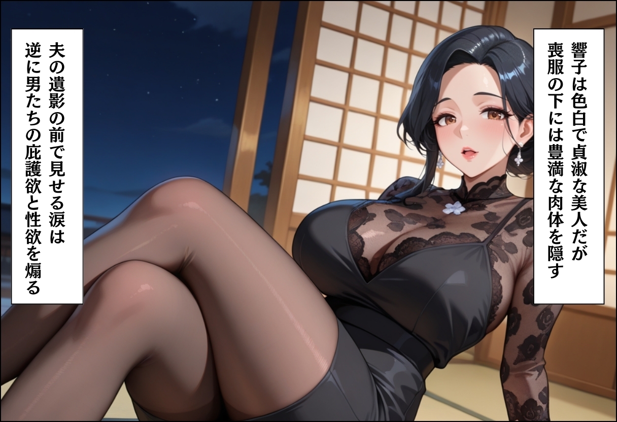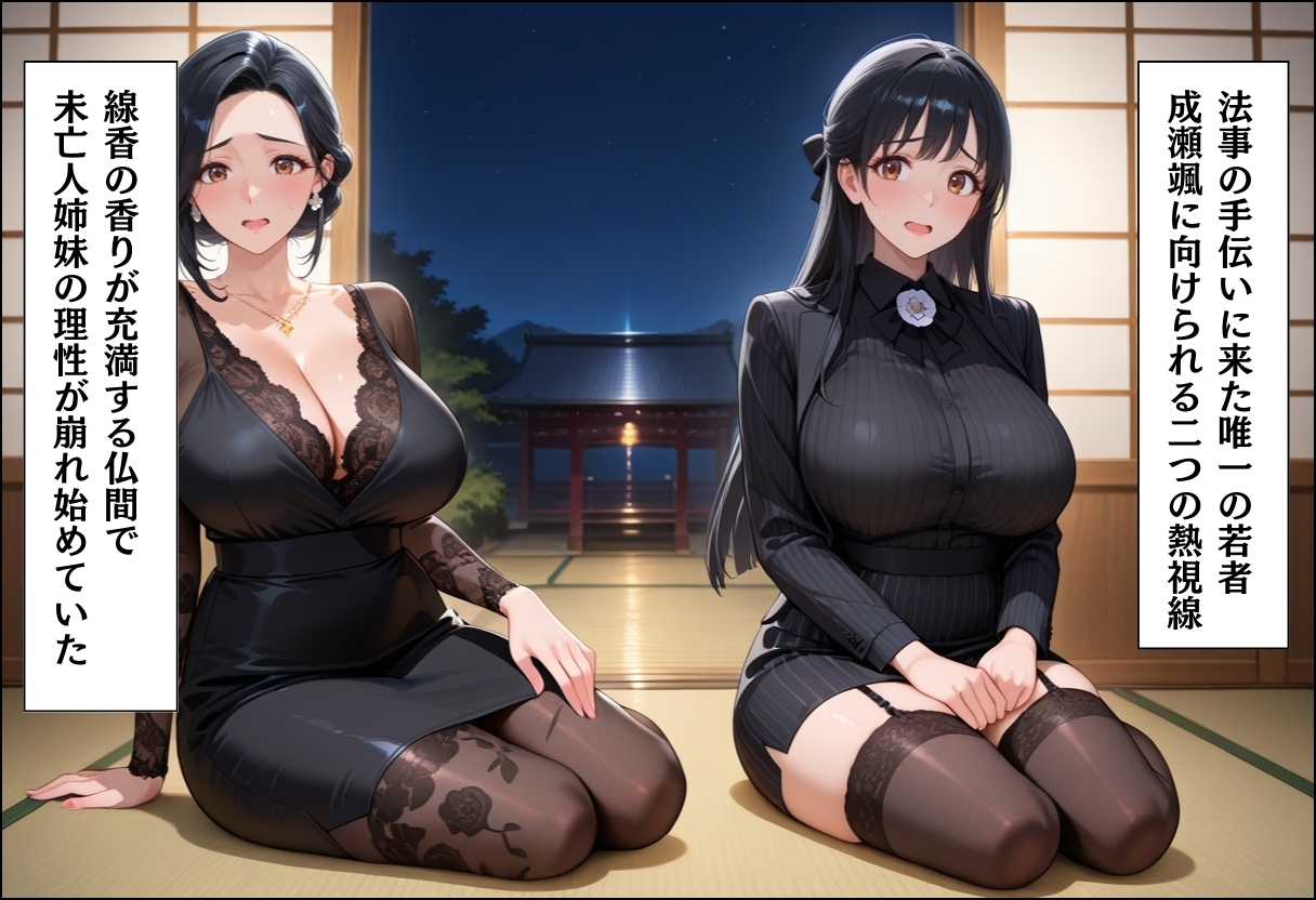 過疎の町、法事の夜。未亡人・響子と妹・奈緒の手伝いをした颯は、汗ばむ若々しい姿で彼女たちの欲情に火をつけてしまう。「供養だと思って慰めて…」酔った姉妹は、夫の遺影が見下ろす仏間で彼に縋り付く。線香の香りが漂う中、喪服のまま繰り広げられる背徳の3P。亡き夫への罪悪感よりも、久々の男の肉体への渇望が勝り、二人の女は若者を貪り尽くす。弔いの夜は淫らな肉宴へと変貌した。
