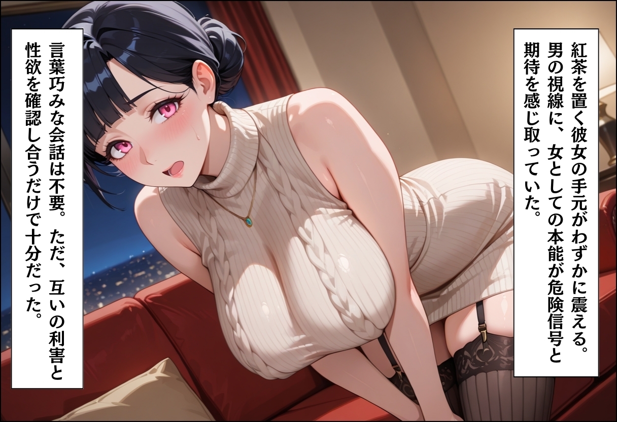 海外赴任の夫を持つ「完璧な母」は、実は長年のレスに乾いていた。その渇きを、息子の友人で「人妻キラー」の大学生・蓮に見抜かれる。雨の午後、薄い部屋着で彼を出迎えた彼女に、蓮は「本当は寂しいんだろ?」と切り込む。彼女は拒絶せず「大人をからかうな」と妖艶に挑発。利害と性欲が合致し、リビングは一転して交尾の場へ。息子の友人というタブーを越え、ただの雄と雌として貪り合う背徳の情事が始まる。