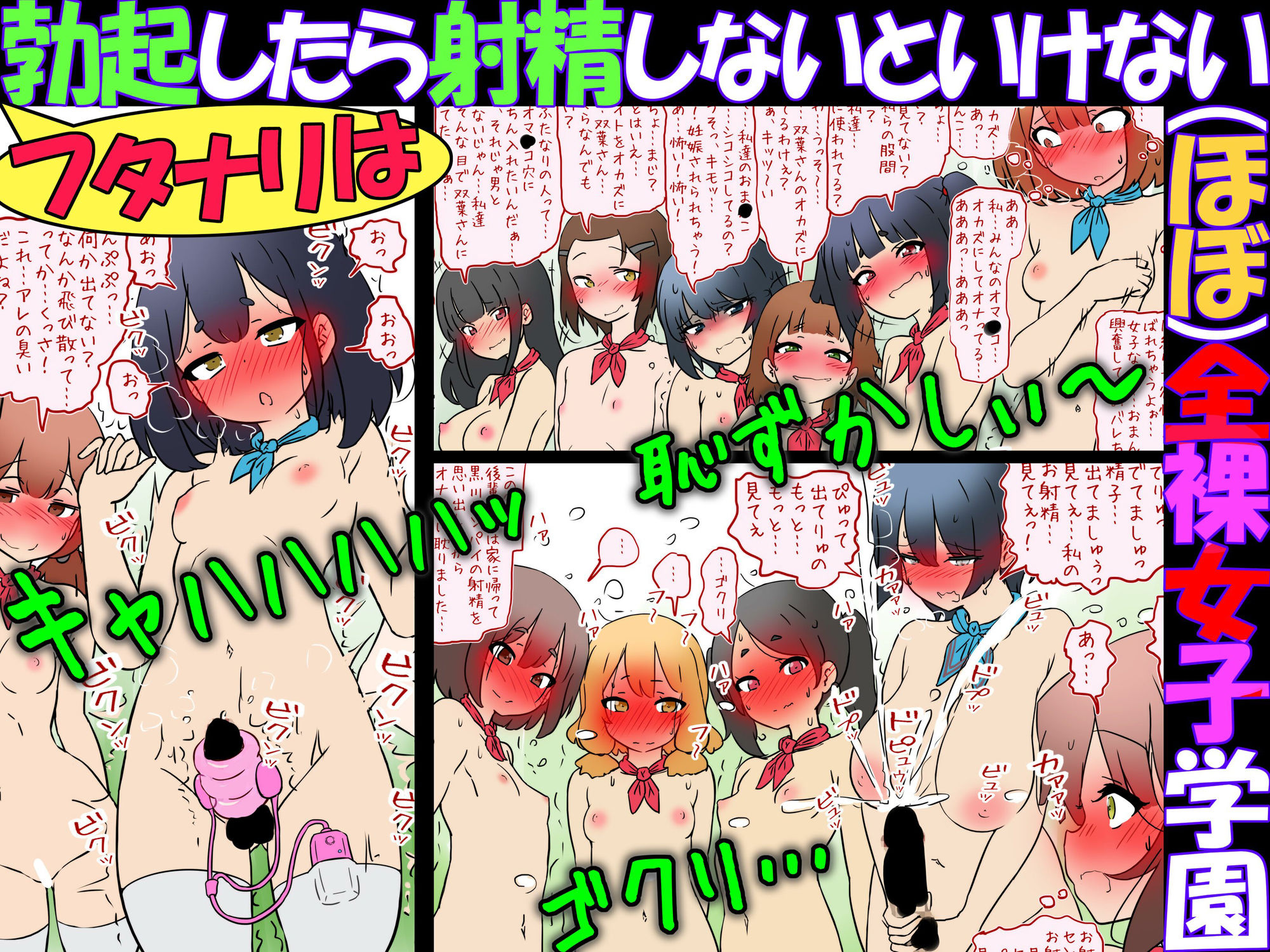 ほぼ全裸女子学園…クラスに1人位はフタナリ女子もいて、 やっぱり他の女子のおま●こなんて見ちゃうと…本能的に勃起しちゃうもの…。 でも、ほぼ全裸女子学園では、フタナリ女子は勃起しちゃったら、3分以内に射精して、おち●ちんを小さくしないと『退学処分』が待っているのだ! だから、勃起しちゃったフタナリ女子は、その場で…他の女子達が見ている前で…シコシコシコシコオナニーをして…ぴゅっと射精しないといけない…