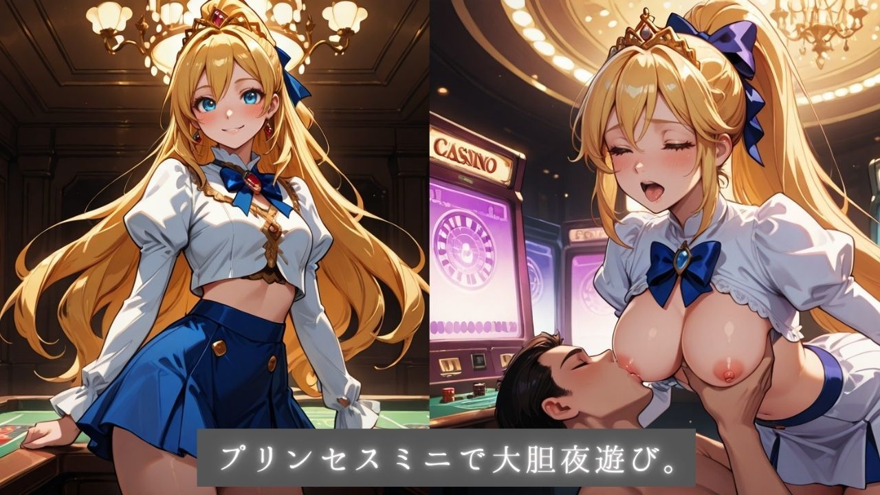 ……次はこのお洋服ですの?まったく隠せていませんわ…… カジノの夜に現れた気高きプリンセス。 ルーレットテーブルの上、遊び心たっぷりのひとときを。 本作は**全編、衣装を脱がない“着エロ表現”**で構成されたCG集です。 プリンセス衣装のまま、距離と仕草が崩れていく背徳感をお楽しみください。