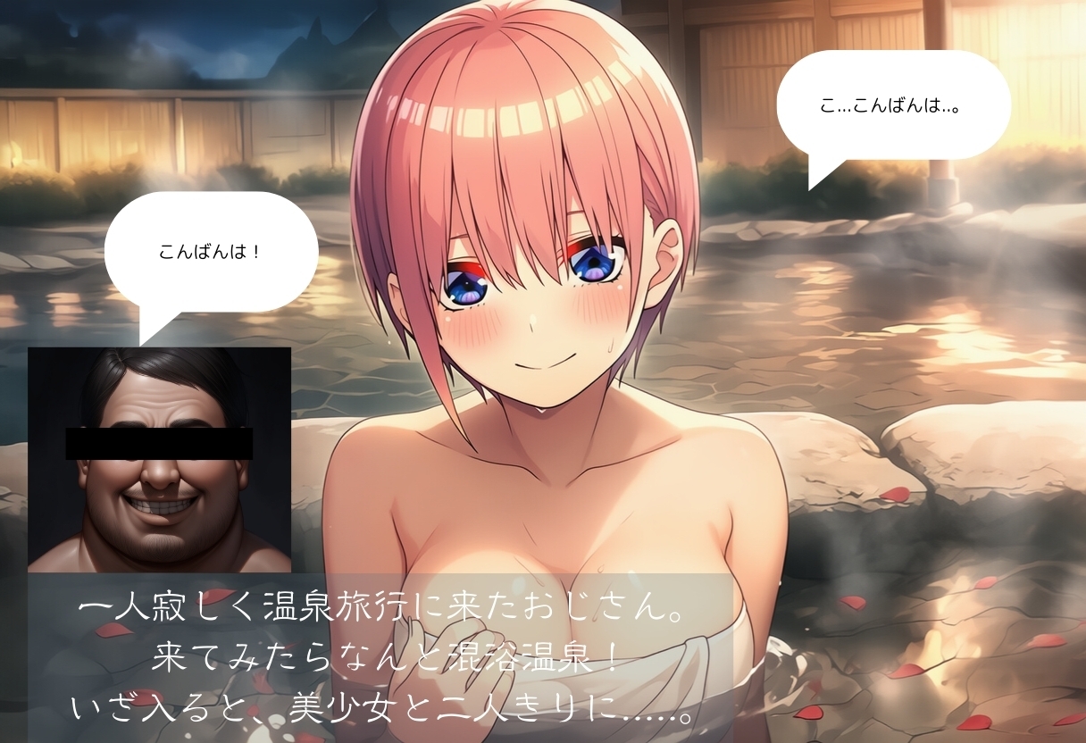 一人寂しく温泉旅行に来たおじさん。来てみたらなんと混浴温泉! いざ入ると、美少女と二人きりに.....。 おじさんは二人きりの空間に我慢できず密かに持ってきた媚薬を温泉に入れ、美少女に襲いかかってしまう!