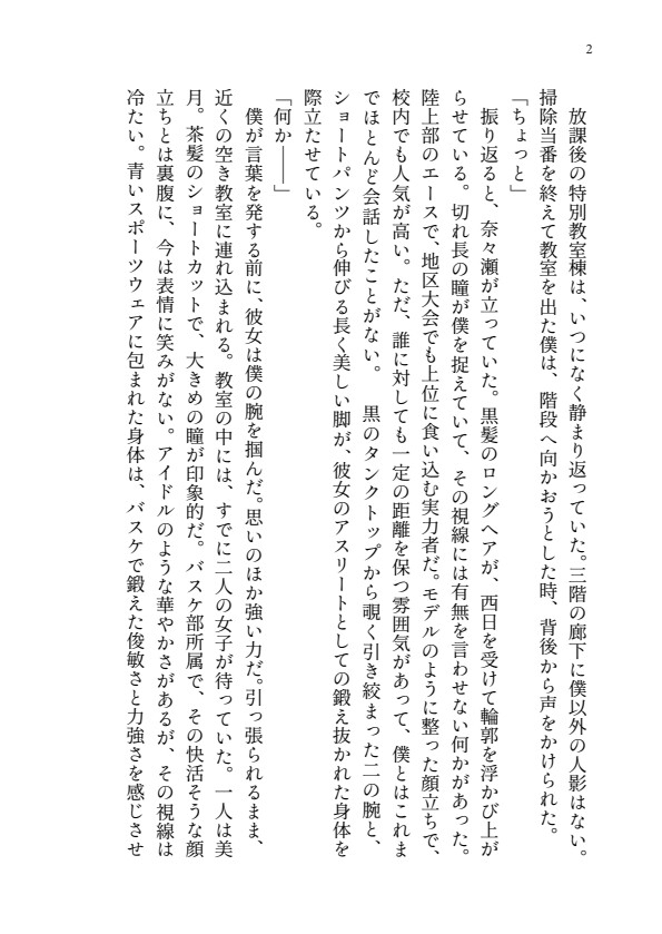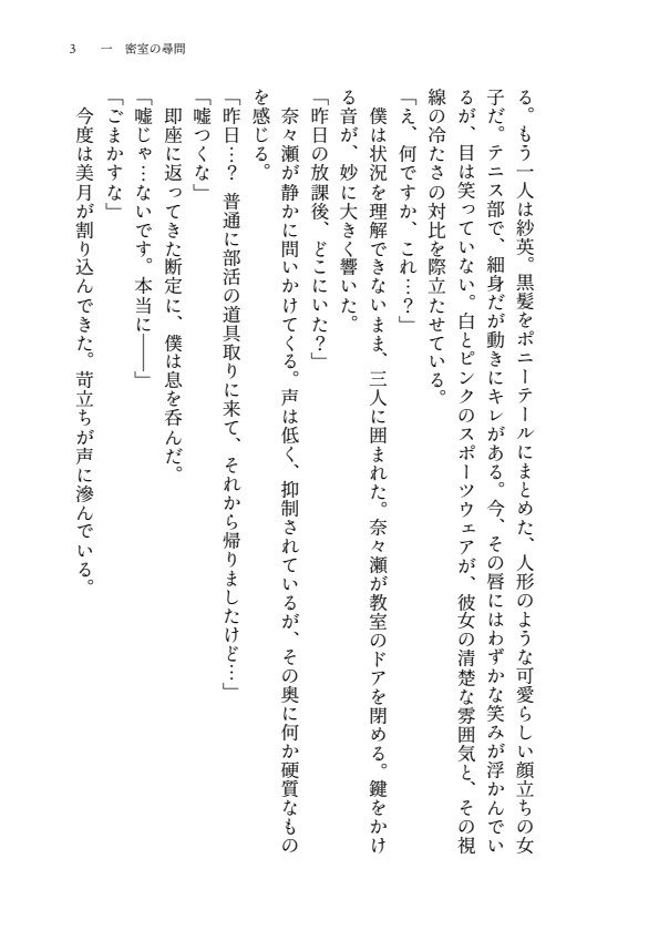 3人の女子アスリートによる容赦ないリンチを描いた本格M格闘小説。密室で追い詰められた主人公が、打撃、蹴り、踏みつけで全身を徹底的に痛めつけられ、絞め技で何度も気絶させられる。恐怖から服従へと心理が変化していく過程を繊細に描写。