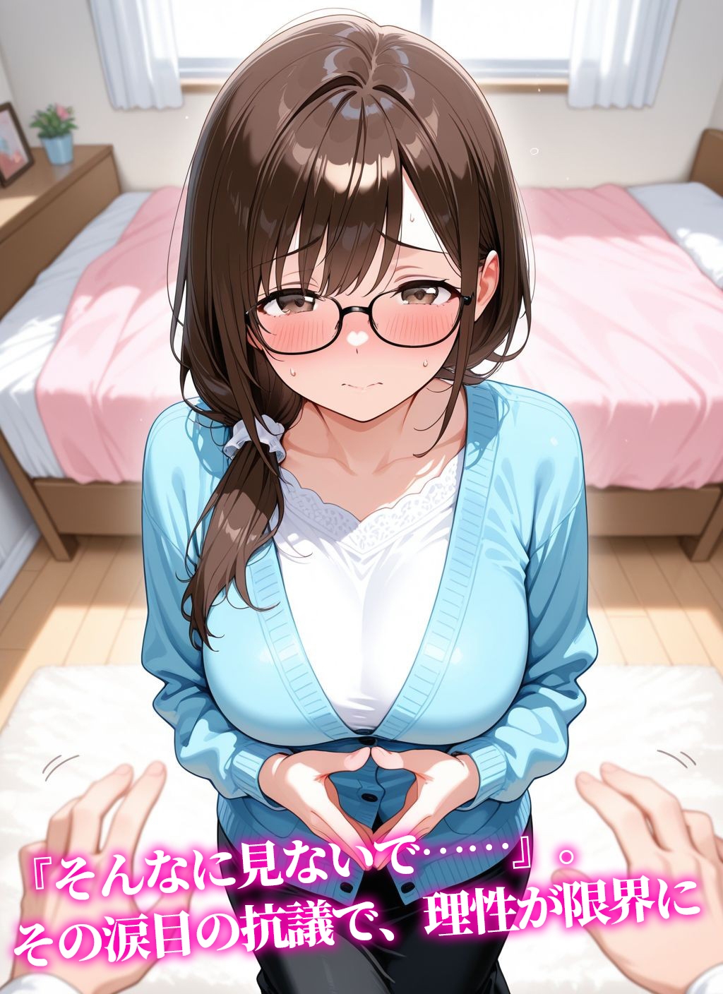 強調された肉感と、涙目でこちらを見つめる恥じらいの表情。 そのあまりの可愛さに、僕の理性は一瞬で吹き飛んでしまった。 「もう……そんなに見ないで……っ」 恥ずかしがる彼女をそのまま抱き寄せ、僕は我慢できずに彼女のすべてを愛し始める……。