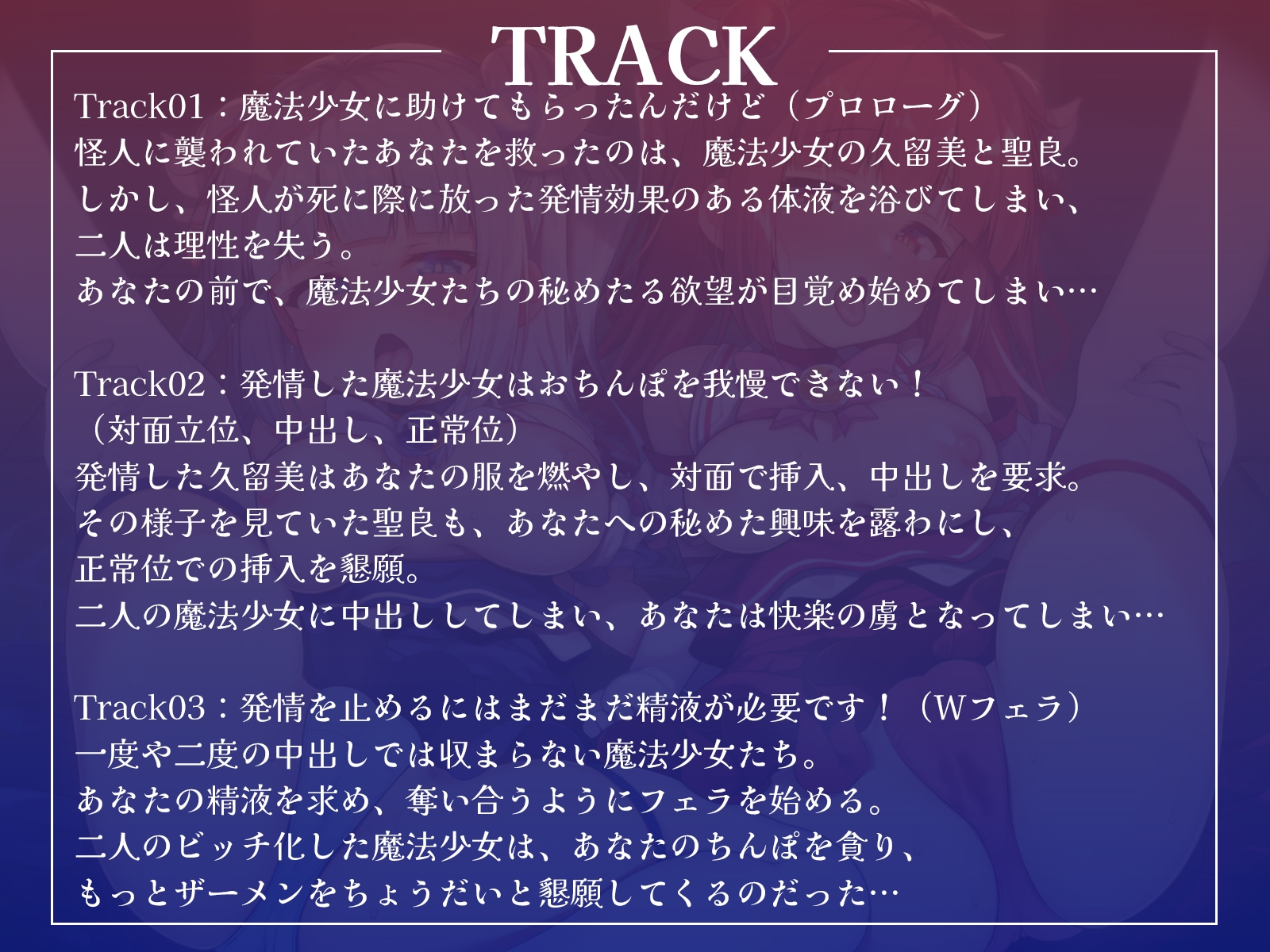 怪人に襲われていたあなたを救ったのは、魔法少女の久留美(ミルキールージュ)と聖良(ブルーソレイユ)。しかし、怪人が放った発情効果のある体液を浴びてしまい、二人は理性を失う。我慢できなくなった久留美はあなたの服を燃やし、対面で挿入、中出しを要求。その様子を見ていた聖良も、あなたへの秘めた興味を露わにし、正常位での挿入を懇願する。一度タガが外れた魔法少女たちは、あなたの精液を求め、欲望のままに迫ってくるのだった…。