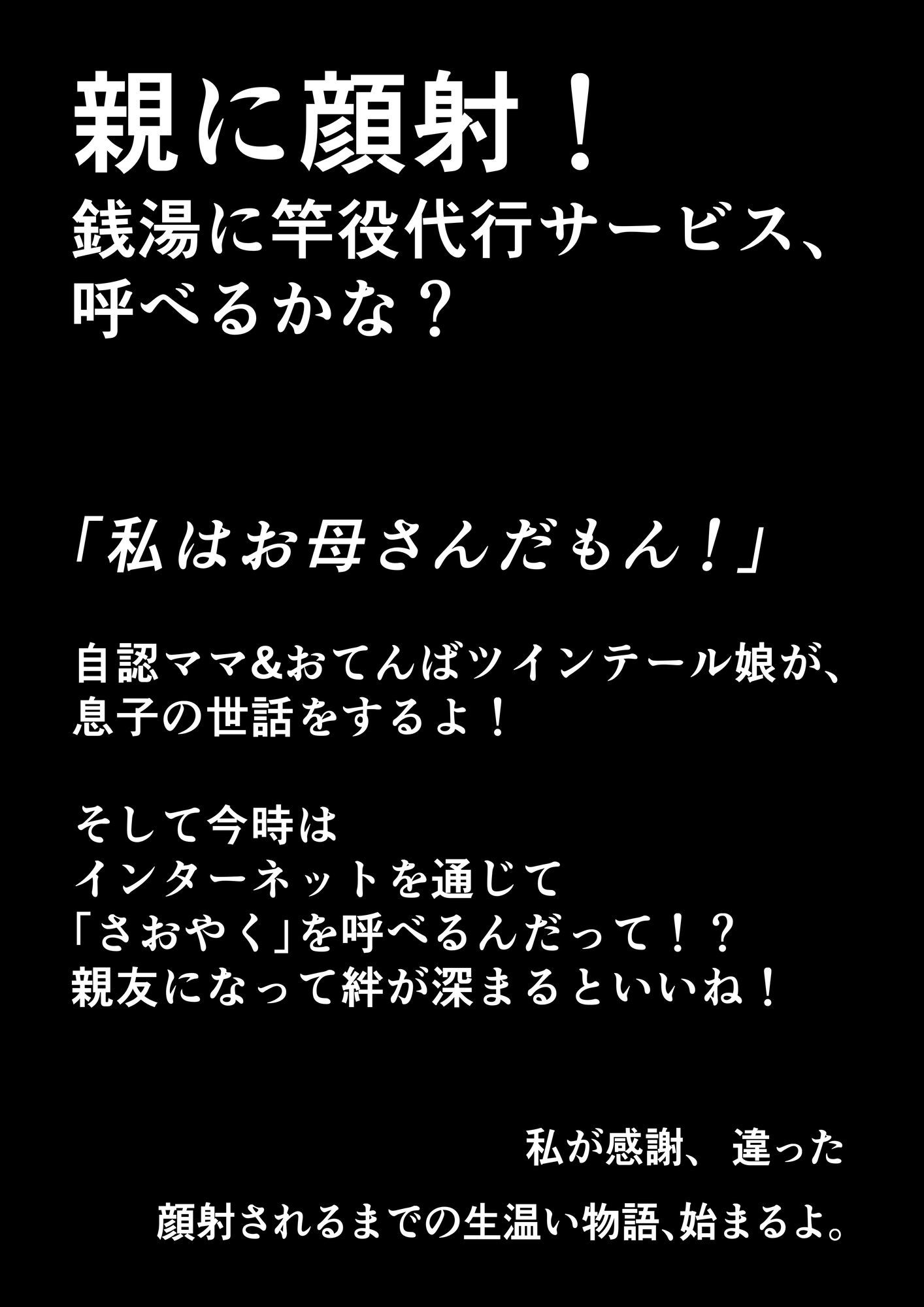 「私はお母さんだもん!」自認ママ&おてんばツインテ娘による息子のお世話。更にインターネットを通して「さおやく」呼びにも挑戦します。顔射されるまでの生温い物語、始まりますよ!フルカラーコミックです。